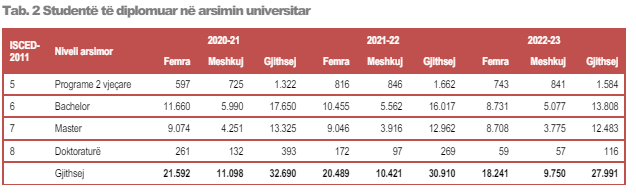 Nga Gazeta Si- Në vitin akademik 2022-23, u diplomuan në arsimin e lartë 27.991 studentë, rreth 3 mijë më pak se në vitin paraardhës dhe rreth 5 mijë më pak se para dy vitesh.