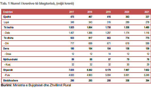Sipas Instat, numri total i gjedhëve ka rënë në 297.656 në vitin 2022, nga 336.784 që ishte në vitin 2021. Për të njëjtën periudhë edhe të gjallesat e leshta, delet, janë më pak, rreth 1.37 milionë, kur një vit më herë ishin 1.48 mln. E njëjta gjë ka ndodhur dhe me të gjitha gjallesat e tjera.