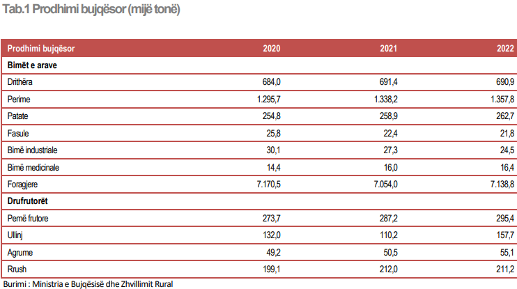 Bujqësia, përveç drithërave që raportohen në rënie, tregohet me rritje, ndonëse jo shumë domethënëse. Në një vit, prodhimi i drithërave ra me rreth 1 mijë tonë. Në të njëjtën periudhë, u rrit lehtë prodhimi i patates, perimeve dhe frutorëve.