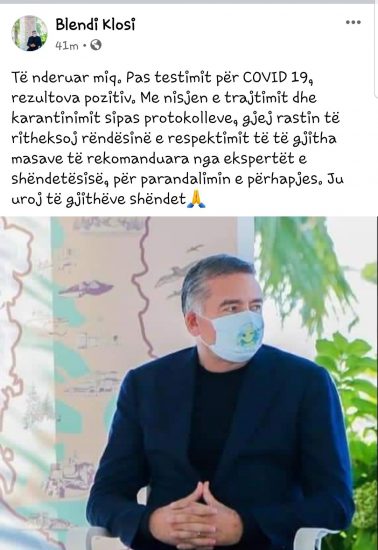 Blendi Klosi, Ministri i Turizmit dhe Mjedisit, ka rezultuar pozitiv me Covid-19. Lajmi është bërë i ditur nga Ministri, nëpërmjet një postimi në rrjetin social “Facebook”.