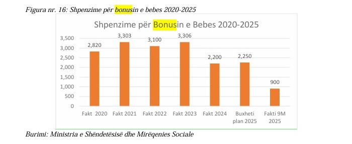 Referuar të dhënave të paraqitura konstatohet një trend në ulje të shpenzimeve për bonusin e bebes, gjë që tregon për një rënie të numrit të lindjeve. Që nga momenti i implementimit deri në 2024-n, përfituesit e bonusit janë pakësuar me 10 mijë dhe fondi i dedikuar për këtë qëllim, mbetet stok.