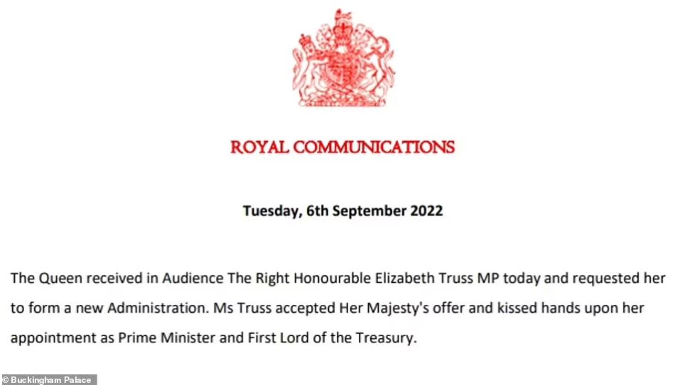 Sipas pallatit mbretëror, Truss pranoi ofertën e Mbretëreshës dhe “i puthi duart pas emërimit si kryeministre”.