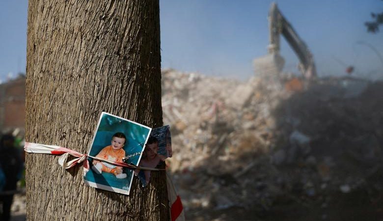 Fotografitë e fëmijëve janë vendosur në një pemë pranë rrënojave, si pasojë e një tërmeti vdekjeprurës në Kahramanmaras, Turqi, 14 shkurt.