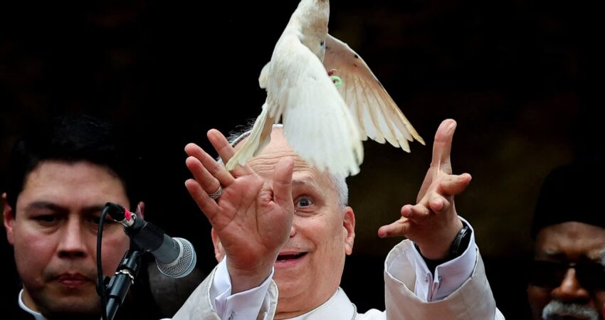 Papa Leo XIV lëshon një zog pranë Kryepeshkopit të Bamendës, Andrew Fuanya Nkea, dhe zyrtarëve të tjerë pas një takimi për paqe me komunitetin e Bamendës në Katedralen e Shën Jozefit në Bamenda, Kamerun, më 16 prill