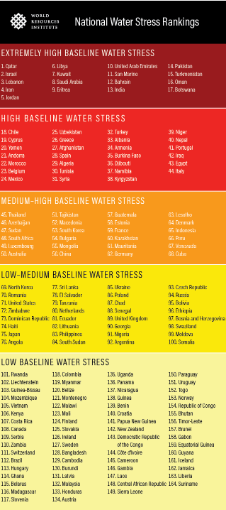 Të dhënat e reja zbulojnë se 17 vende – shtëpia e një të katërtës së popullsisë së botës – përballen me nivele “jashtëzakonisht të larta” të stresit për ujin, ku bujqësia, industritë dhe komunat përdorin më shumë se 80% të furnizimit të tyre në dispozicion mesatarisht çdo vit. Dyzet e katër vende, shtëpia e një e treta e botës, përballen me nivele “të larta” të stresit, ku mesatarisht më shumë se 40% e furnizimit në dispozicion konsumohet çdo vit. Në këtë fashë bën pjesë edhe Shqipëria, e cila përballet me shfrytëzim të lartë të burimeve ujore.