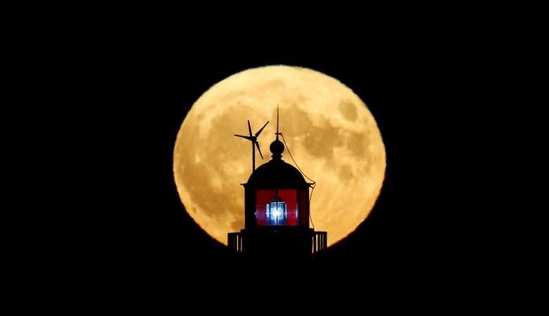 Një hënë e plotë e njohur si "Buck Moon" shihet pas një fari në Saint-Nazaire, Francë, 13 korrik.