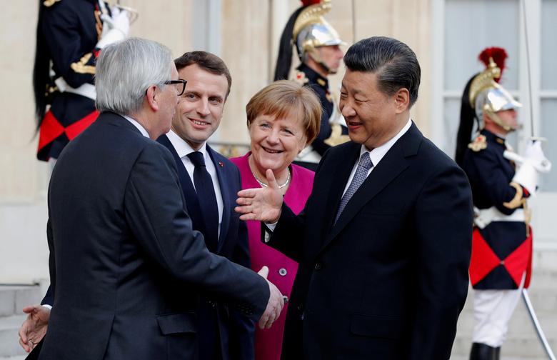 Presidenti francez Emmanuel Macron, kancelarja gjermane Angela Merkel dhe presidenti i Komisionit Evropian Jean-Claude Junckermirëpresin presidentin kinez Xi Jinping në Pallatin Elysee në Paris.