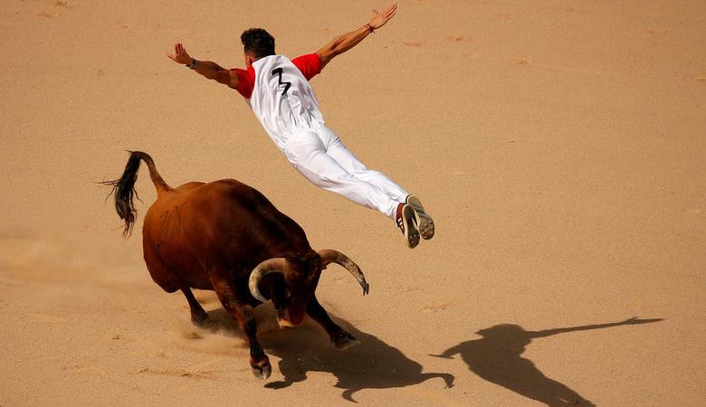 Një fitues i rekordit u hodh mbi një dem pasi fitoi garën e tij, në festivalin San Fermin në Pamplona, Spanjë, 13 korrik.