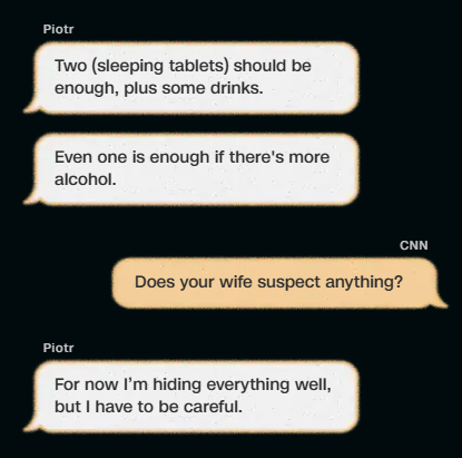 Në Poloni, gruaja që Piotr tha se ishte gruaja e tij gjithashtu duket se nuk është në dijeni të asaj që po i ndodh.