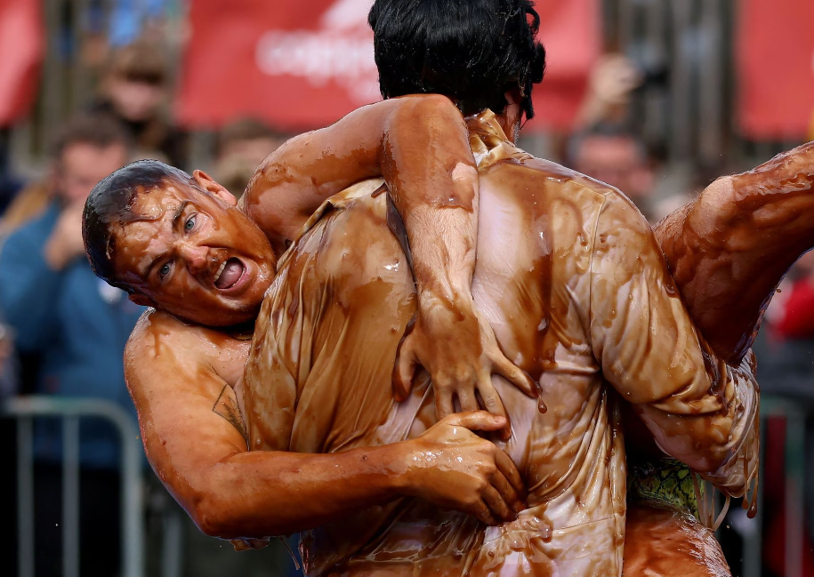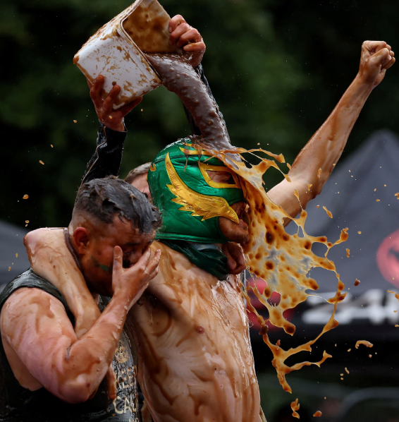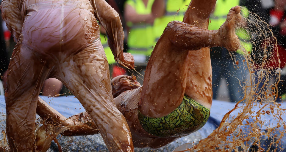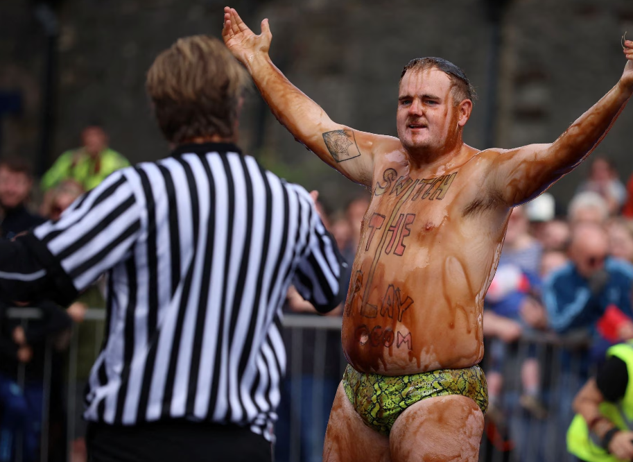 Rreth 2000 litra lëng mishi janë përdorur në kampionatin botëror të mundjes e cila mbahet çdo vit në pijetoren Rose ‘N’ Bowl në Stacksteads, Britani. Garuesit, synojnë të fitojnë titullin kampion duke mposhtur kundërshtarin e tyre gjatë një ndeshje mundjeje të gjatë dy minutëshe ndërkohë që janë të mbuluar nga lëngu i mishit dhe salca.