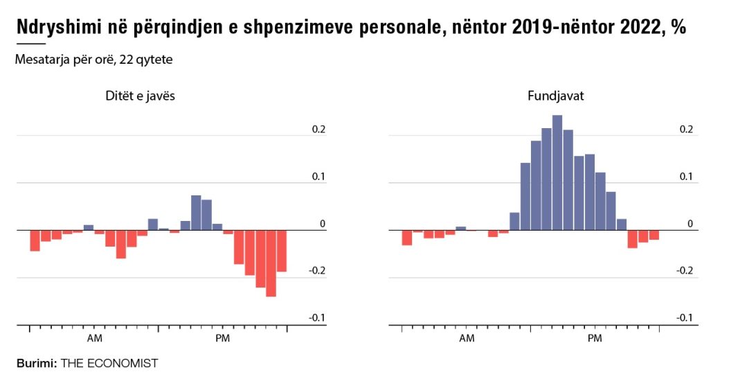 Është folur shumë për efektin që tregon se ku kalojnë kohën njerëzit (më pak në qendrat e qyteteve, më shumë në zonat më periferike). Por pak dihet sesi ky ndryshim ka ndryshuar oraret e njerëzve.