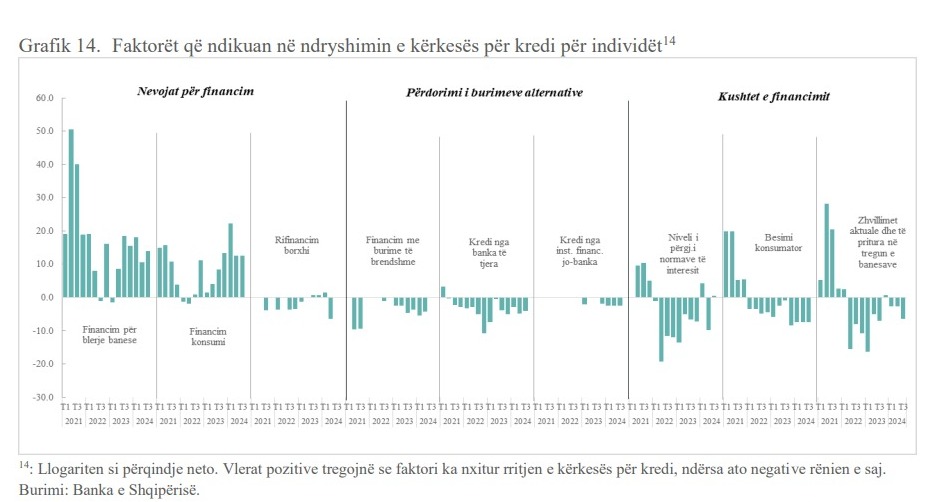Kërkesa e individëve për kredi u perceptua më e lartë në tremujorin e tretë, si në blerjen e banesave, ashtu edhe në financimin e konsumit. Kërkesa më e lartë për financimin e konsumit dhe ajo për financimin në blerjen e banesave ishin faktorët kryesorë që sollën rritjen e kërkesës për kredi në këtë tremujor. Në drejtim të kundërt me to ndikuan besimi konsumator dhe zhvillimet aktuale e të pritura në tregun e banesave. Faktorët e tjerë patën ndikime minimale.