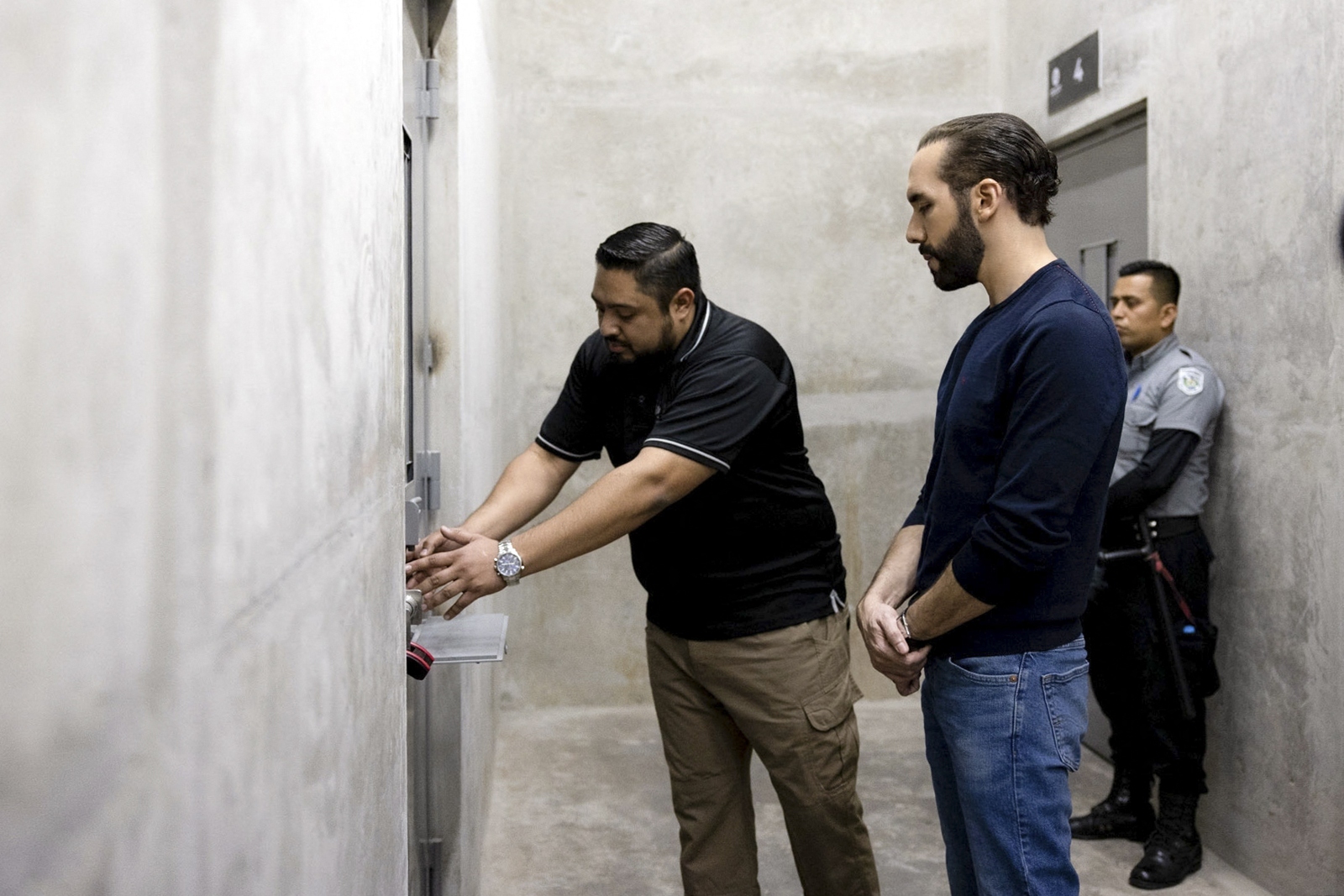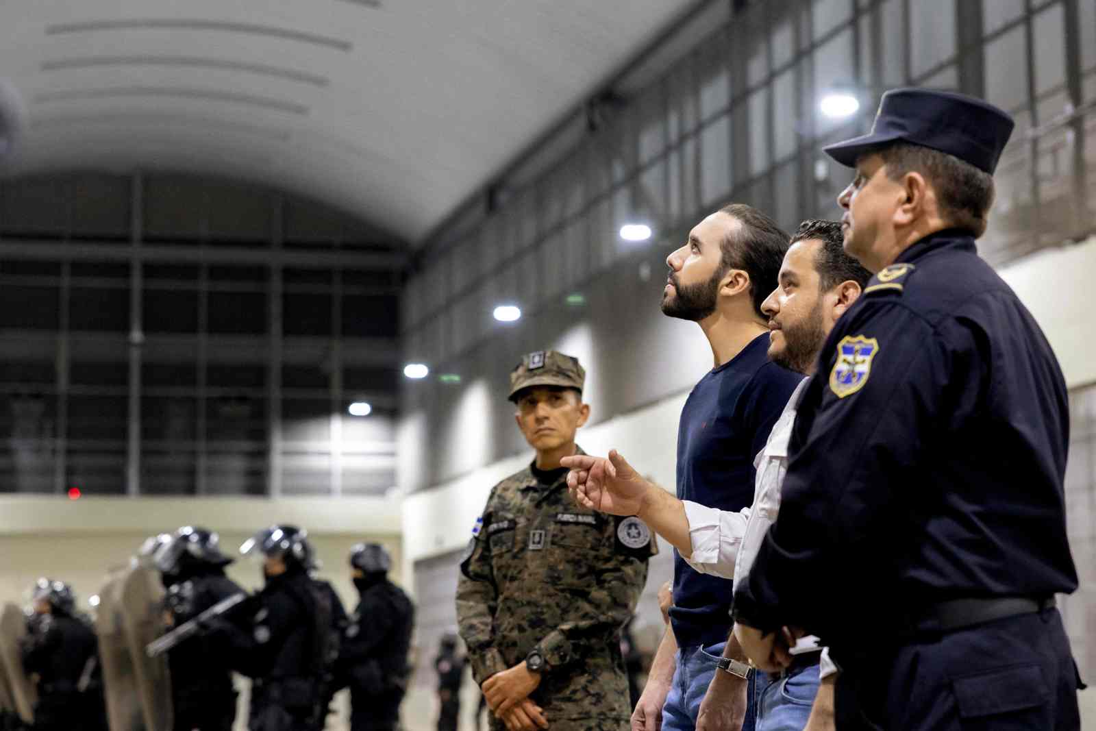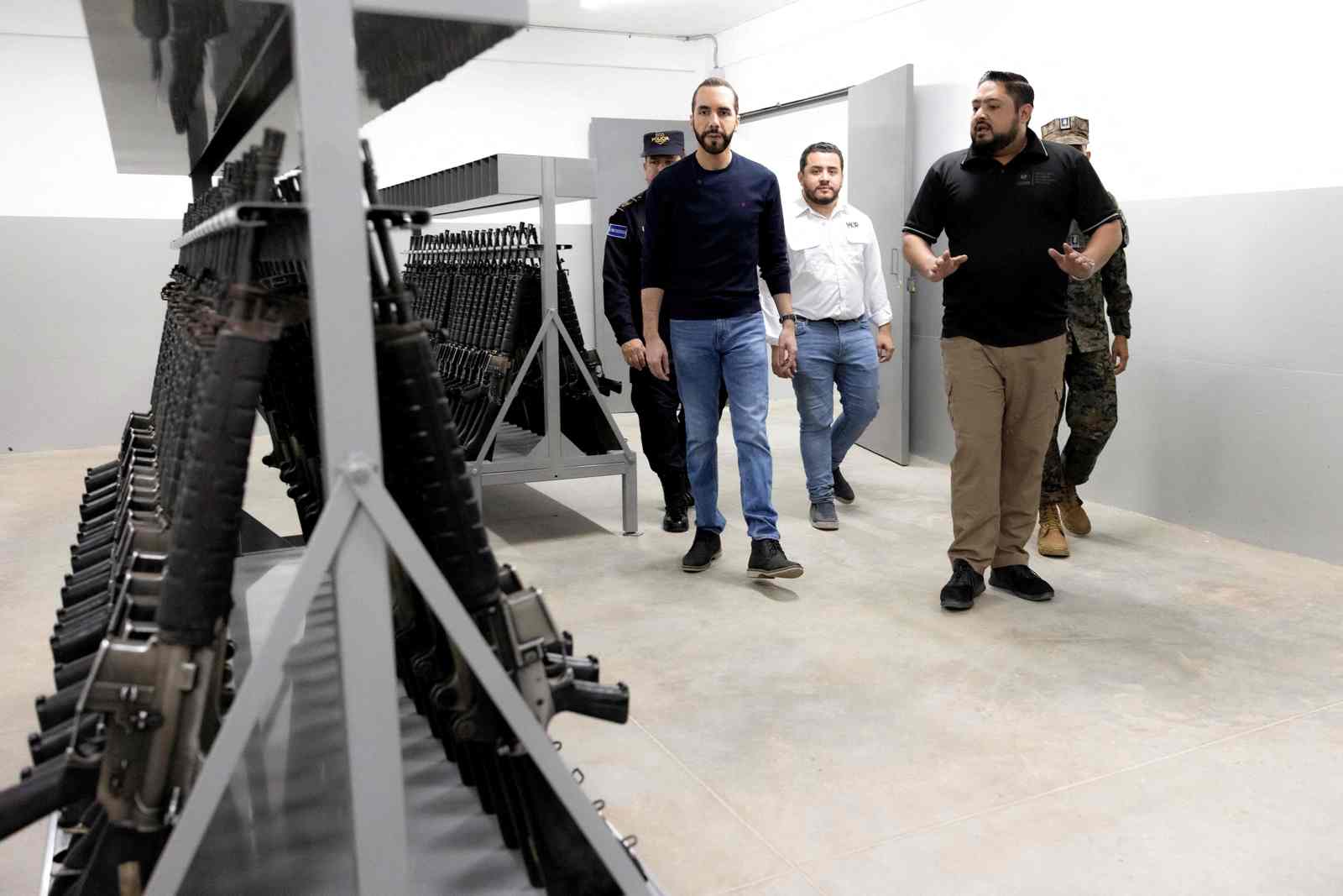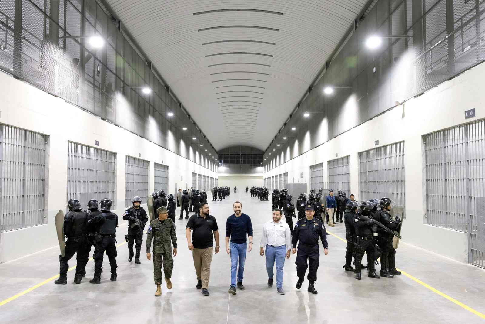 Bukele (në foto, me xhinse, duke vizituar burgun), tha se qeveritë e mëparshme salvadoriane “i lejuan anëtarët e bandave të qëndronin në burg me prostituta, PlayStations, TV, celularë, kompjuterë… duke shpërblyer shkelësit”.