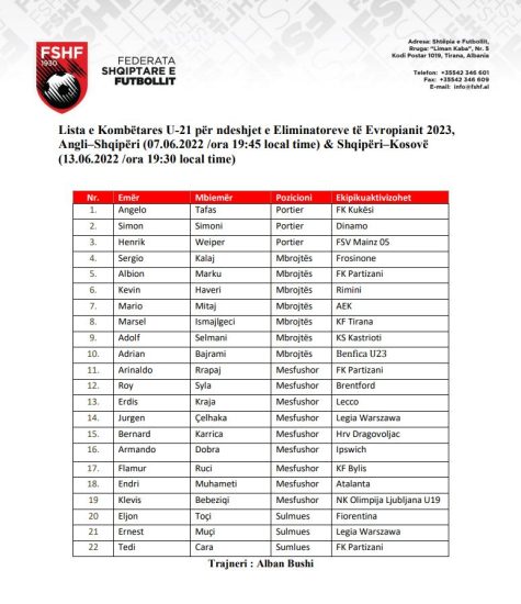 Gazeta Si – Trajneri i Kombëtares U-21, Alban Bushi, shpalli sot listën me lojtarët e grumbulluar për ndeshjet me Anglinë dhe Kosovën. Janë dy ndeshjet e fundit eliminatore të Europianit 2023, që zhvillohen më 7 dhe 13 qershor.
