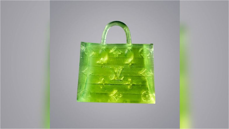 Çanta, e cila mezi duket me sy të lirë, ka ngjyrë të verdhë-të gjelbër fluoreshente dhe bazohet te një dizajn i njohur i Louis Vuitton – por nuk është prodhim i markës luksoze.