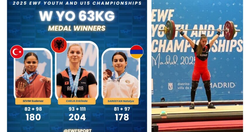Nga Gazeta Si – Peshëngritësja Enkileda Carja ishte sportistja e ditës në evropianin e Madridit (U15 & të rinj) që po zhvillohet në Spanjë. Sportistja shqiptare bëri një paraqitje brilante duke thyer 3 rekorde Evropiane në rrugën e saj drejt medaljeve të arta. Në kategorinë 63 kg, Carja ngriti 93 kg në shkëputje dhe 111 kg në shtytje për 204 kg në total. Në këtë mënyrë Carja ngriti 24 kg më shumë se vendi i dytë (turkja Sevim Sudenaz – 82 kg + 98 kg = 180 kg) dhe 206 kg më shumë se vendi i tretë (armenja Sargsyan Natalya – 81 kg + 97 kg = 178 kg).
