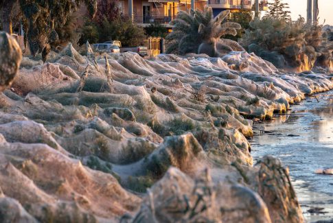 Video-Merimangat gjigante mbulojnë bregun e liqenit grek