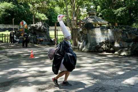 Me qafën e gjatë, bustin e rrumbullakët, pendët e bishtit dhe ecjen e rëndë, krijesa e madhe që po ndiqet rreth një kopshti zoologjik tajlandez nga veterinerët me rrjetë duket të jetë një struc. Por…