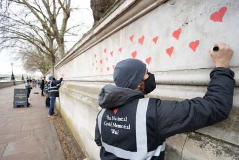 Në një mur pranë spitalit St. Thomas në Londër, qytetarët kanë bërë nga një zemër për personat që kanë humbur jetën për shkak të Covid-19. /The Guardian/