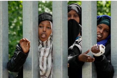 Një grua somaleze kalon dorën e saj të lidhur me fasho përmes shufrave metalike të rrethimit që ndan Bjellorusinë me Poloninë. Së bashku me katër gra të tjera, ato i mbajnë sytë drejt Bashkimit…