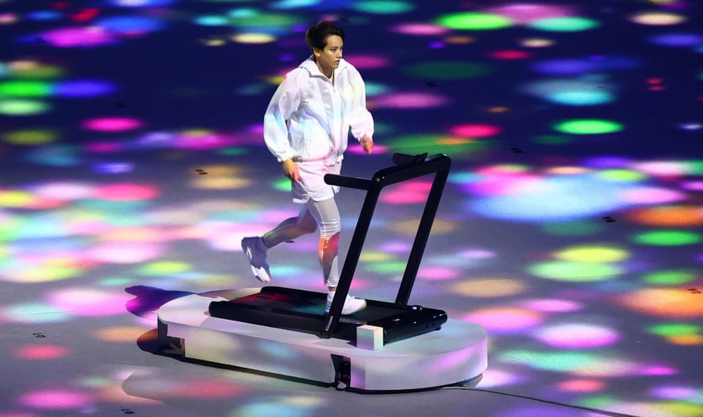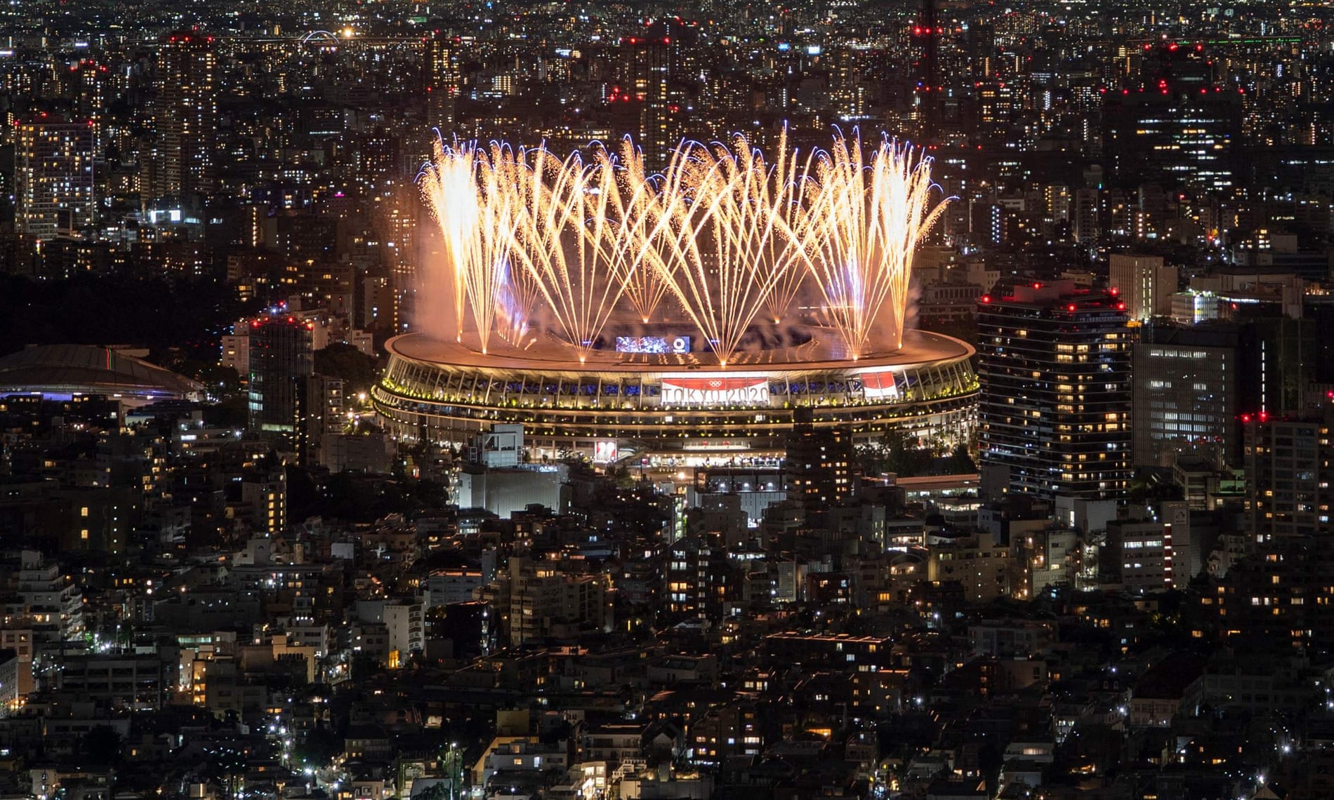Me flakadanë të mëdhenj dhe fishekzjarrë shumë ngjyrëshe  ndriçojnë qiellin gjatë ceremonisë së hapjes së Lojërave Olimpike të Tokios. Në një stadium kombëtar pothuajse të zbrazët, pa asnjë energji tifozësh, shfaqja filloi me një atlet të vetëm që ishte i gjunjëzuar në qendër të stadiumit. Ndërsa qëndronte, hija pas saj mori formën e një fidani në shenje shprese./The Guardian/