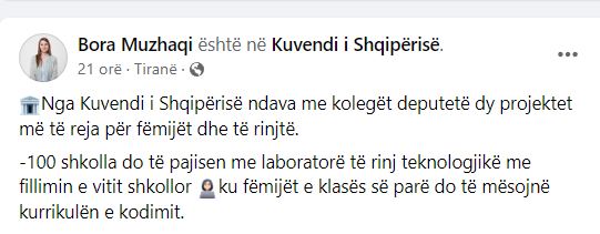 Nga Anxhela Çelanji – Deklarata e Ministres për Rininë dhe Fëmijët Bora Muzhaqi se do të përfshihet kodimi si lëndë qysh në klasën e parë ka marrë vëmendjen e ekspertëve të arsimit dhe më gjerë. “Fillimin e vitit të ri shkollor 100 shkolla në të gjithë Shqipërinë do të pajisen me laboratorë teknologjikë të rinj. Fëmijët e klasës së parë do të mësojnë kurrikulën e kodimit. Këta fëmijë bashkë me ata që ndjekin kodimin si lëndë ekstrakurrikulare do të jenë ata që do të hapin rrugën për Shqipërinë e teknologjisë për të konkurruar në mënyrë të denjë me bashkëmoshatarët europianë”, u pat shprehur Bora Muzhaqi.