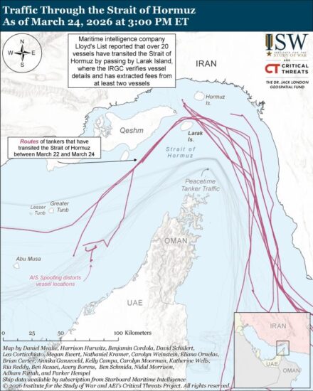 Përpara luftës, anijet tregtare që kalonin nëpër ngushticë kalonin në jug të Larakut, por në javët e fundit, regjimi iranian i ka detyruar anijet e pakta që lejon të kalojnë tranzit të ndryshojnë kurs dhe të kalojnë tranzit në veri të ishullit, për një kontroll më të mirë, siç tregohet në hartën më poshtë.