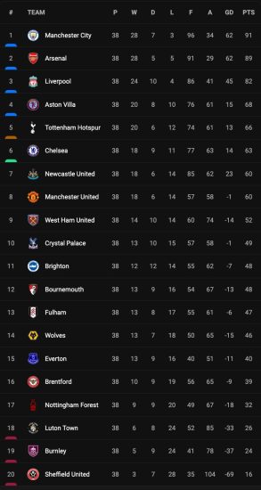 Arsenali, pavarësisht se zhvilloi një kampionat mbresëlënës, e mbyll i dyti me vetëm një pikë më pak se City, Liverpooli i treti dhe Aston Villa në vendin e katërt, plotësojnë katërshen e ekipeve angleze që do të luajnë në Champions League sezonin e ardhshëm.