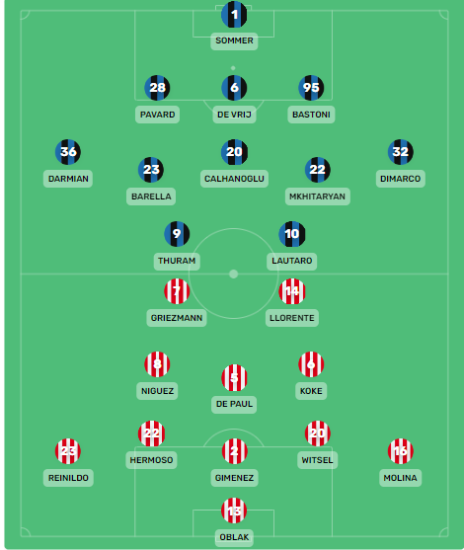Alvaro Morata ka pasur një dëmtim, por Simeone e ka grumbulluar për sfidën e sotme. Në anën tjetër, Interi zbret me formacionin e tij tip, me dy lojtarët e krahëve, Dimarko dhe Darmian që u kursyen në kampionat. Në mbrojtje luajnë De Vrij, Pavard dhe Bastoni. Shpresat janë te dyshja e sulmit, Lautaro Martinez-Turam, që në kampionat po bën shumë mirë.