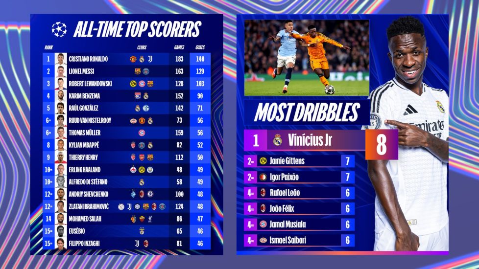 Në sfidën e parë në Skoci, Harry Kane u bë anglezi i parë që shënon 60 gola në Kupat e Evropës. Pas golit të 7 në Champions League, Mario Pašalić barazoi Duván Zapata-n dhe Josip Iličić si shënuesit më të mirë për Atalanta-n në Champions League. Serhou Guirassy (10 gola) barazoi rekordin e Erling Haaland dhe Robert Lewandowski-t si shënuesit më të mirë të Dortmund në një sezon në Champions League. Dy golat që shënoi në transfertë e çuan Dembélé në kuotën e 18 golave në 11 ndeshjet e fundit në të gjitha kompeticionet për PSG.
