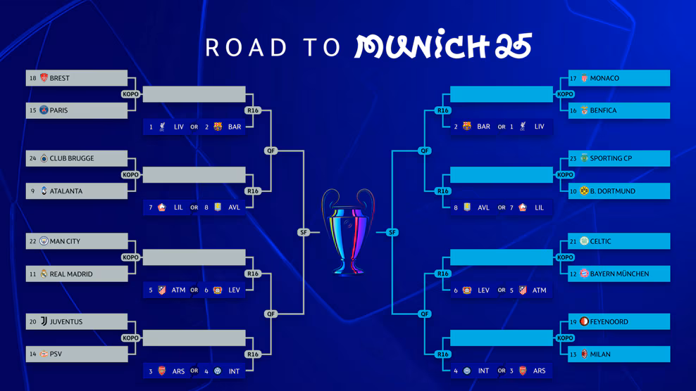Sfidë e cila u paralajmërua në fillimin e sezonit kur UEFA riorganizoi strukturën e kompeticionit. City (fituese në vitin 2023) dhe Madrid (fituese në fuqi) ashtu si edhe Bayern, Juventus apo dhe Milan paguajnë hapat falsë, madje kampionët e Anglisë rrezikuan të eleminoheshin në përfundim të 45 minutave të para në raundin e 8. Skocezët e Celtic (skuadra e parë britanike që fitoi kompeticionin në 1967) do të luajnë ndaj Bayern Munich ndërsa bie në sy edhe derbi francez mes surprizës Brest dhe kampionëve të shumëfishtë transalpinë, Paris Saint-Germain. Fituesit e sfidës City-Madrid dhe Bayern-Cletic do të ndeshen me një mes Leverkusen dhe Atletico Madrid.