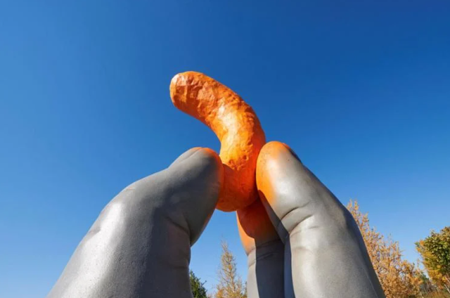 Marka “Cheetos” ngriti statujën e një dore që mban një patatinë masive, të kompletuar me majat e gishtave portokalli.
