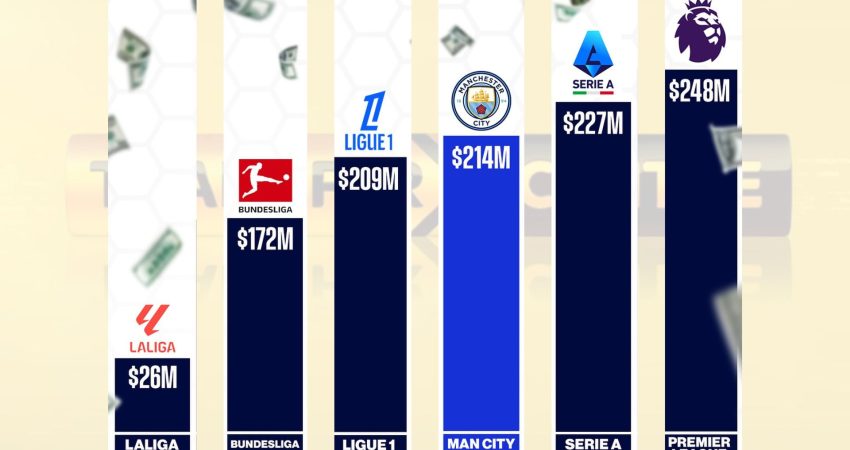Më pak se Manchester City, shpenzuan edhe 20 skuadrat pjesëmarrëse në Ligue 1. 209 milionë dollarë dolën nga arkat transalpine ku në të shkuarën Paris SG linte pas këdo në Evropë me investimet përforcuese. Më pak se 200 milionë u shpenzuan në Bundesliga, konkretisht 172 milionë dollarë në një kampionat të njohur për vlerësimin e bilancit më shumë se emrin e lojtarit në merkato. Në fund La Liga, më e varfëra në Evropë që si asnjëherë më parë, harxhoi vetëm 26 milionë dollarë.