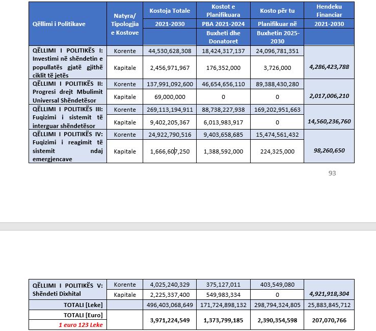 Në raport përcaktohet se përllogaritja e kostove është bërë sipas viteve financiare. Kostoja e përgjithshme e përllogaritur për zbatimin e Planit të veprimit për zbatimin e Strategjisë Kombëtare të Shëndetësisë 2021-2030 është rreth 496.40 miliardë Lekë.