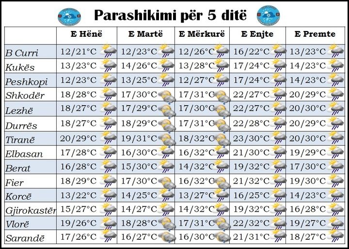 Moti për të gjithë ditët e javës parashikohet me kthjellime por nga orët e mesditës dhe më pas parashikohet shtim vranësirash deri të dendura. Vranësirat në relievet kodrinore-malore do të shoqërohen me reshje shiu të herëpashershme me intensitet të ulët deri dhe mesatar.