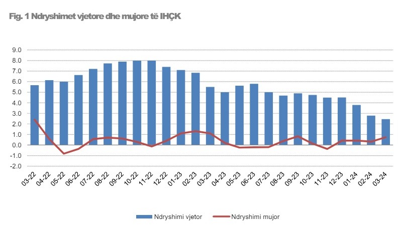 Treguesi është ulur lehtë nga muaji shkurt, por grupet e shportës, nga ushqimet tek transporti raportohen me rritje. Rritja më e madhe e çmimeve vërehet në grupin e shërbimit arsimor me 4.2%, pasuar nga grupet argëtim dhe kulturë me 3.9%, mobilim, pajisje shtëpie dhe mirëmbajtje me 3.6 %.