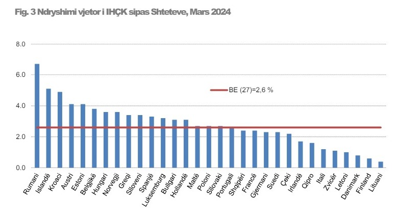 Prej muajsh, inflacioni në Shqipëri ishte ndjeshëm më i lartë se vendet e pasura të bllokut, por tashmë qëndron poshtë mesatares europiane prej 2.6%. Gjithsesi, Shqipëria lë pas vende si Gjermania, Suedia, etj, për nivelin e rritjes së çmimeve.