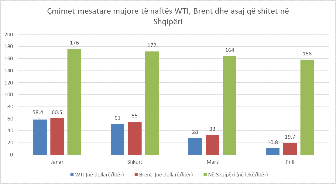 Çmimet e naftës në tregun botëror kanë zbritur këto ditë në nivele rekord. Nafta bruto Brent tregtohet me 19.77 dollarë për fuçi ndërsa cmimi i naftës bruto WTI për herë të parë kapi çmime nën zero, e paparë kjo ngjarje që prej nisjes të tregtimit të saj për herë të parë më 1983-shin.