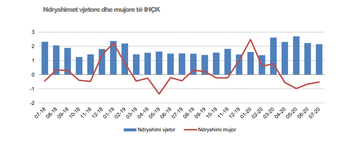 Por në Korrik 2020, ndryshimi mujor (pra krahasuar me muajin parardhës) i matur nga Indeksi i Harmonizuar i Çmimeve të Konsumit është -0,5 %. Ky ndryshim është ndikuar kryesisht nga ulja e çmimeve të grupit “Ushqime dhe pije joalkoolike” me 2,0 %, pasuar nga grupet “Argëtim dhe kulturë” me 1,0 % dhe “Veshje dhe këpucë” me 0,1 %. Nga ana tjetër çmimet e grupit “Transporti” u rritën me 2,6 %, pasuar nga grupet “Pije alkoolike dhe duhan” dhe “Mallra dhe shërbime të ndryshme” me 0,3 % secili dhe “Mobilim, pajisje shtëpie dhe mirëmbajtje” me 0,1 %.