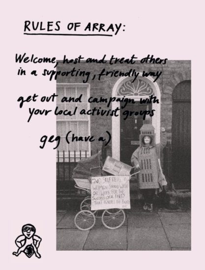 Historia e Irlandës Veriore dhe ndarjet fetare sigurojnë materiale të djegshme për Array. Ajo kërkon të krijojë një kulturë të re, jo-sektare duke përdorur ritualet dhe folklorin, si dhe duke bërë shfaqje dhe art protestues për abortin, të drejtat LGBTQ+.