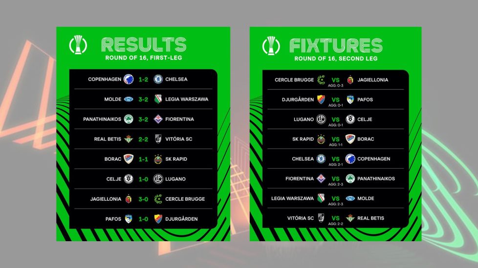 Chelsea, Panathinaikos dhe Molde do të tentojnë të ruajnë vantazhin ndaj Copenhagen, Fiorentina-s dhe Legia Warszawa-s respektivisht kur të ndeshen në sfidat e dyta të UEFA Conference League. Një javë më parë Jagiellonia u ndesh për të tretën herë me një kundërshtare nga Belgjika duke arritur edhe fitoren e parë. Pafos ka krijuar më shumë raste (151 në total) se çdo skuadër tjetër në Conference League. Mesfushori i Celje-s, Svit Sešlar është njeriu që shërben më shumë në Conference League me 7 asist. Ndërsa Sebastijan Herera (19, Borac) dhe Mamadou Sangaré (18, SK Rapid) janë dy lojtarët që kanë thyer më shumë aksione në Conference League.