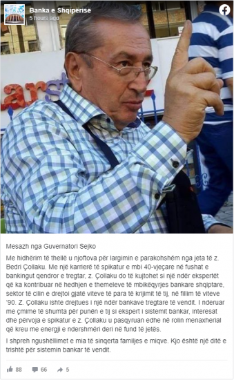“Me hidhërim të thellë u njoftova për largimin e parakohshëm nga jeta të Bedri Çollaku. Me një karrierë të spikatur e mbi 40-vjeçare në fushat e bankingut qendror e tregtar, Çollaku do të kujtohet si një ndër ekspertët që ka kontribuar në hedhjen e themeleve të mbikëqyrjes bankare shqiptare, sektor të cilin e drejtoi gjatë viteve të para të krijimit të tij, në fillim të viteve ‘90. Z. Çollaku ishte drejtues i një ndër bankave tregtare të vendit. I nderuar me çmime të shumta për punën e tij si ekspert i sistemit bankar, interesat dhe përvoja e spikatur e z. Çollaku u pasqyruan edhe në rolin menaxherial që kreu me energji e ndershmëri deri në fund të jetës. Kjo është një ditë e trishtë për sistemin bankar të vendit”, shkruan Sejko.