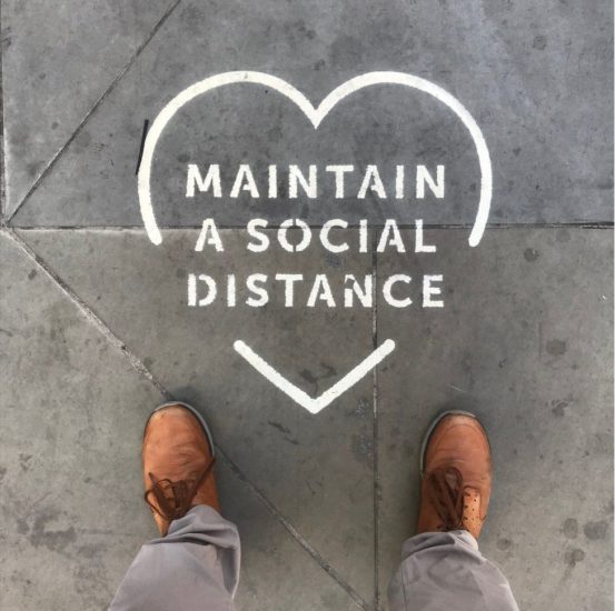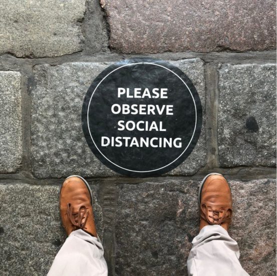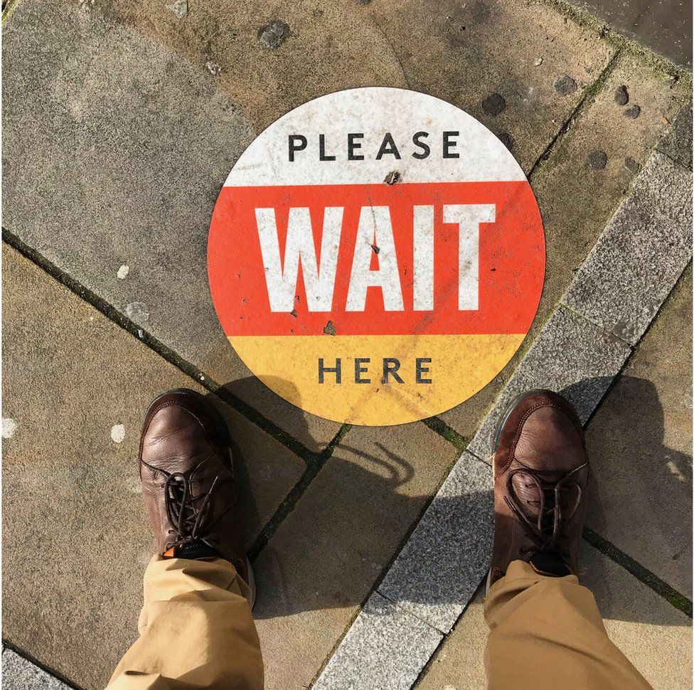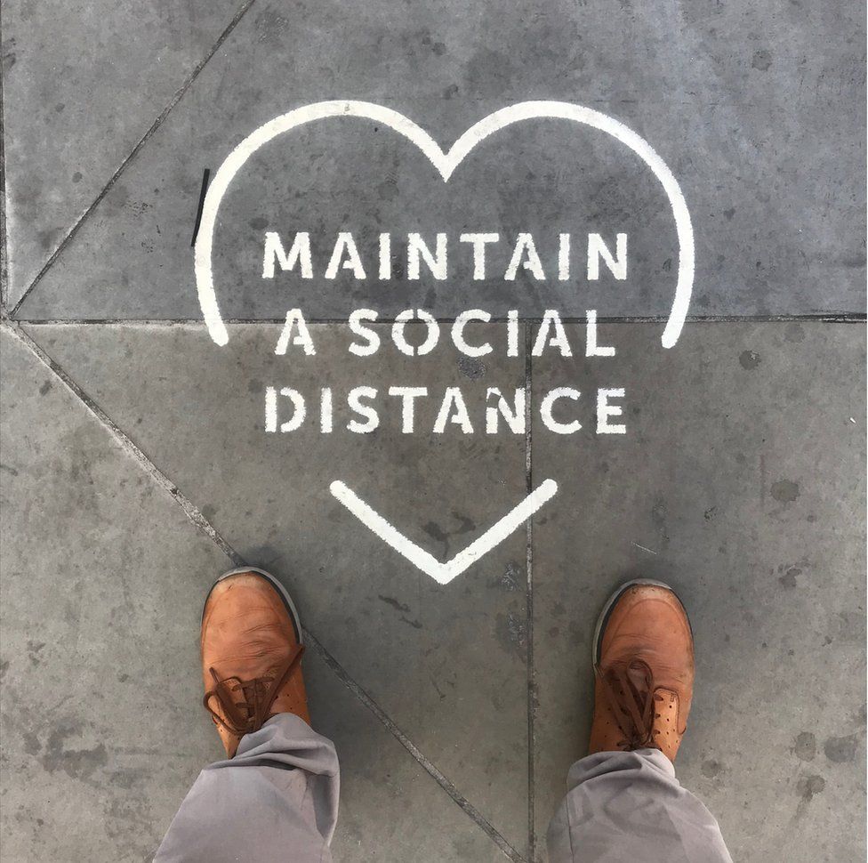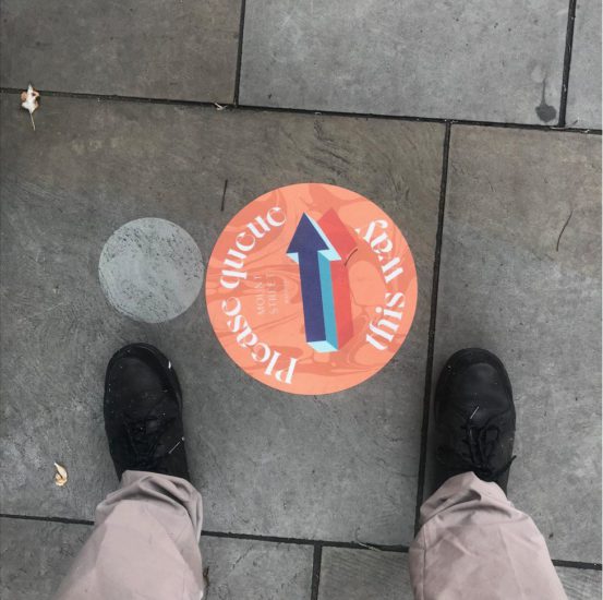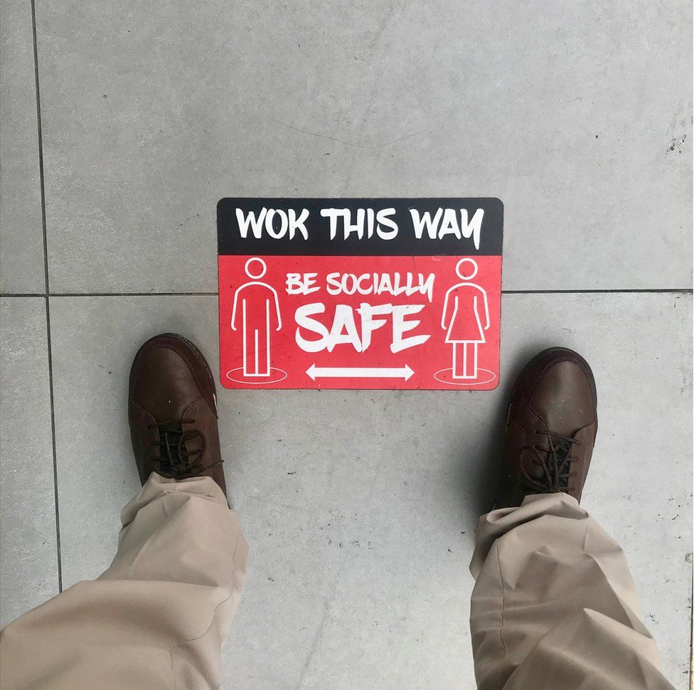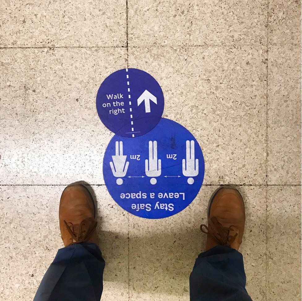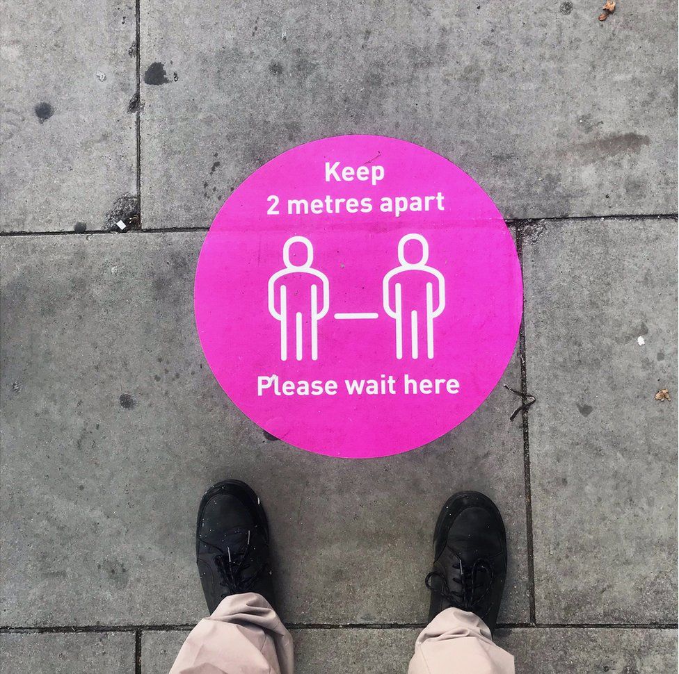 Shenjat i kujtojnë njerëzve të mbajnë distancën sociale dhe i udhëzojnë ata ku të qëndrojnë në rradhë.Shumica prej tyre janë në gjuhën angleze.