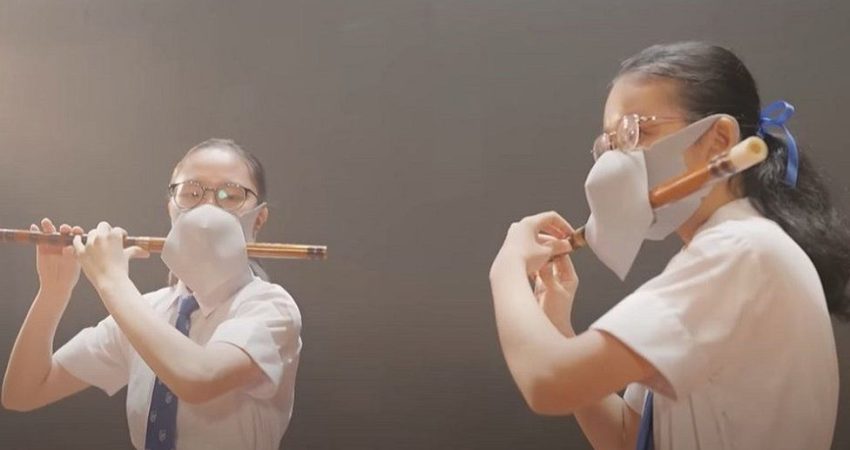 Në 45 sekonda, video tregon dy nxënëse të maskuara duke luajtur flautin krah për krah.
