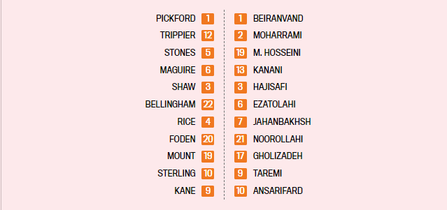 Anglia ka një sulm të fortë, ku përveç kapiteni Kejn, janë edhe Sterling dhe Foden të preferuarit e trajnerit Southgejt për të luajtur nga minuta e parë. Tek Irani mungon sulmuesi Azmun.