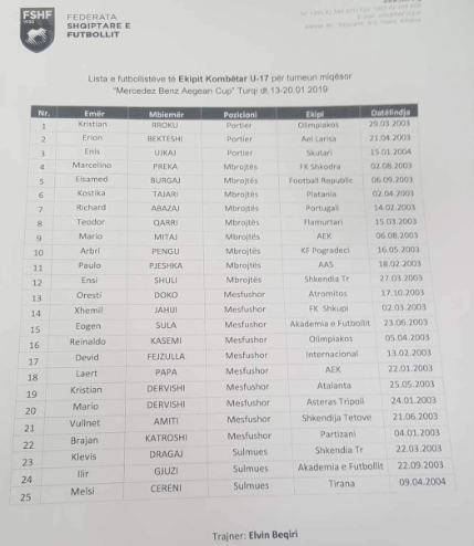 Edhe trajneri i U-17-ës, Elvin Beqiri, ka grumbulluar një numër të madh lojtarësh të kampionatit tonë. Ekipi i tij është pjesëmarrës në trofeun “Mercedes Benz” që zhvillohet në Turqi në datat 14-17 janar. Në këtë kompeticion marrin pjesë 8 kombëtare moshash, të ndara në 2 grupe. Kuqezinjtë 17-vjeçarë bëjnë pjesë në Grupin B, ku janë edhe Spanja, Rusia dhe Maqedonia. Skuadra të tjera pjesëmarrëse janë Anglia, Turqia, Azerbajxhani dhe Moldavia.