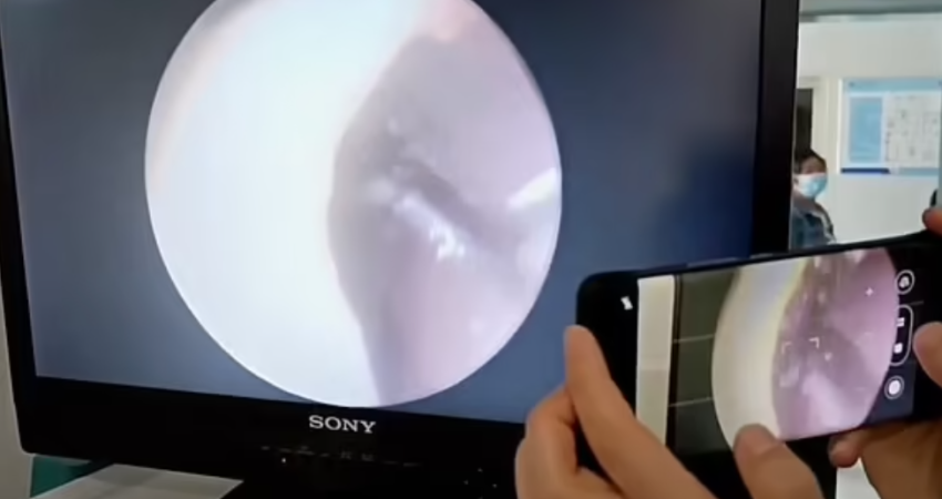 Në video, mjeku mund të shihet duke tërhequr një rrjetë të hollë për të zbuluar më pas merimangën e gjallë. E habitur nga ndërhyrja, merimanga sulmoi tubin endoskopik.