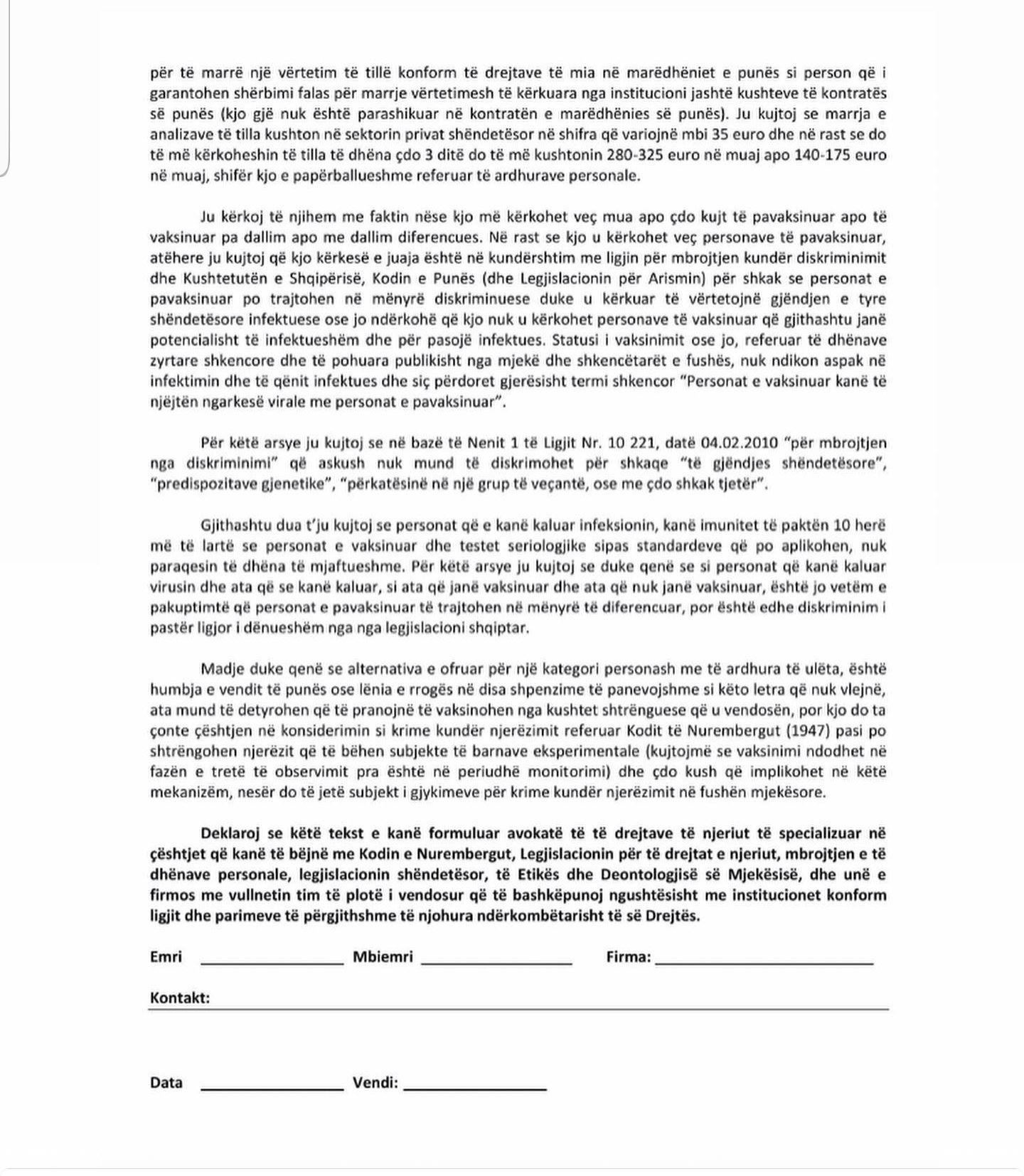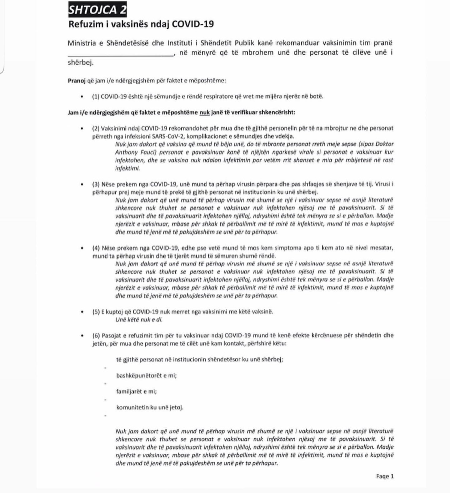 Në rrjete sociale po qarkullon një deklaratë për vërtetimin e mos vaksinimit.