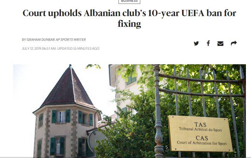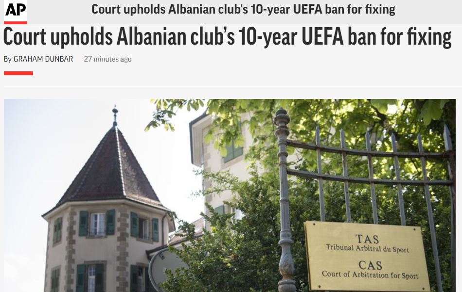 Dënimi i paprecedentë ndaj Skënderbeut për të mos marrë pjesë për 10 vite në kompeticionet europiane ka shkaktuar një tronditje të madhe në futbollin shqiptar. Klubi korçar që ka dominuar në futbollin tonë në 10 vitet e fundit e shikon veten të dënuar në mënyrë definitive nga shkalla më e lartë e gjyqësorit sportiv, CAS. Ky dënim kaq i rëndë që u konfirmua nga gjykata e arbitrazhit sportiv është më i rëndi në historinë e futbollit europian. Jehona e këtij vendimi i kalur edhe kufijtë e Europës, duke u shpërndarë nga disa prej medieve më të mëdha në botë. The Washington Post, Associated Press, Daily Gazette Holzminden, Daily Mail, kanë qenë vetëm disa nga gazetat më të mëdha botërore që kanë shkruar për këtë vendim kundër klubit shqiptar.