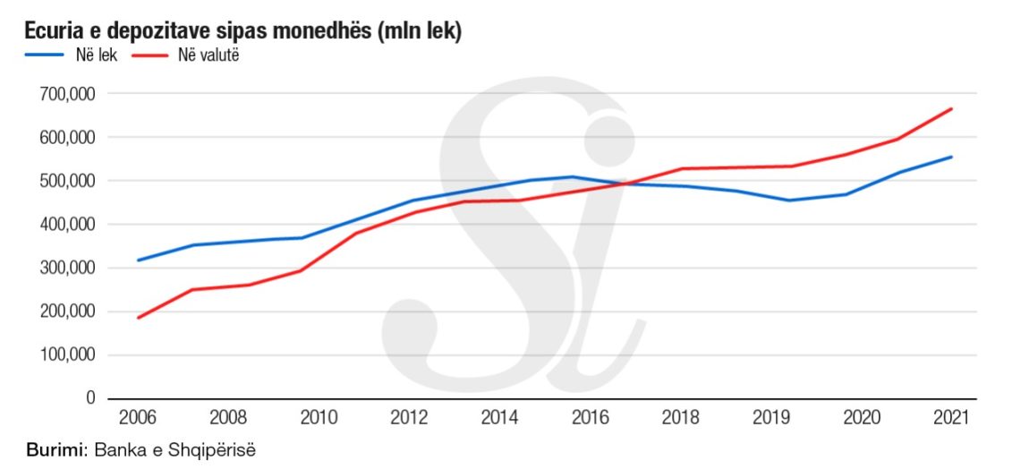 Në fund të vitit 2021, rreth 55.4% e kursimeve ishin në valutë, kryesisht në euro, nga 48.3% një dekadë më parë.